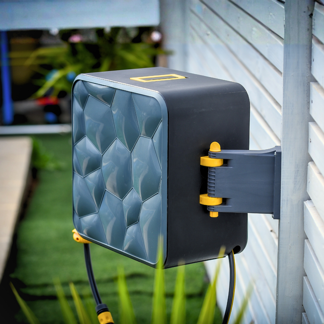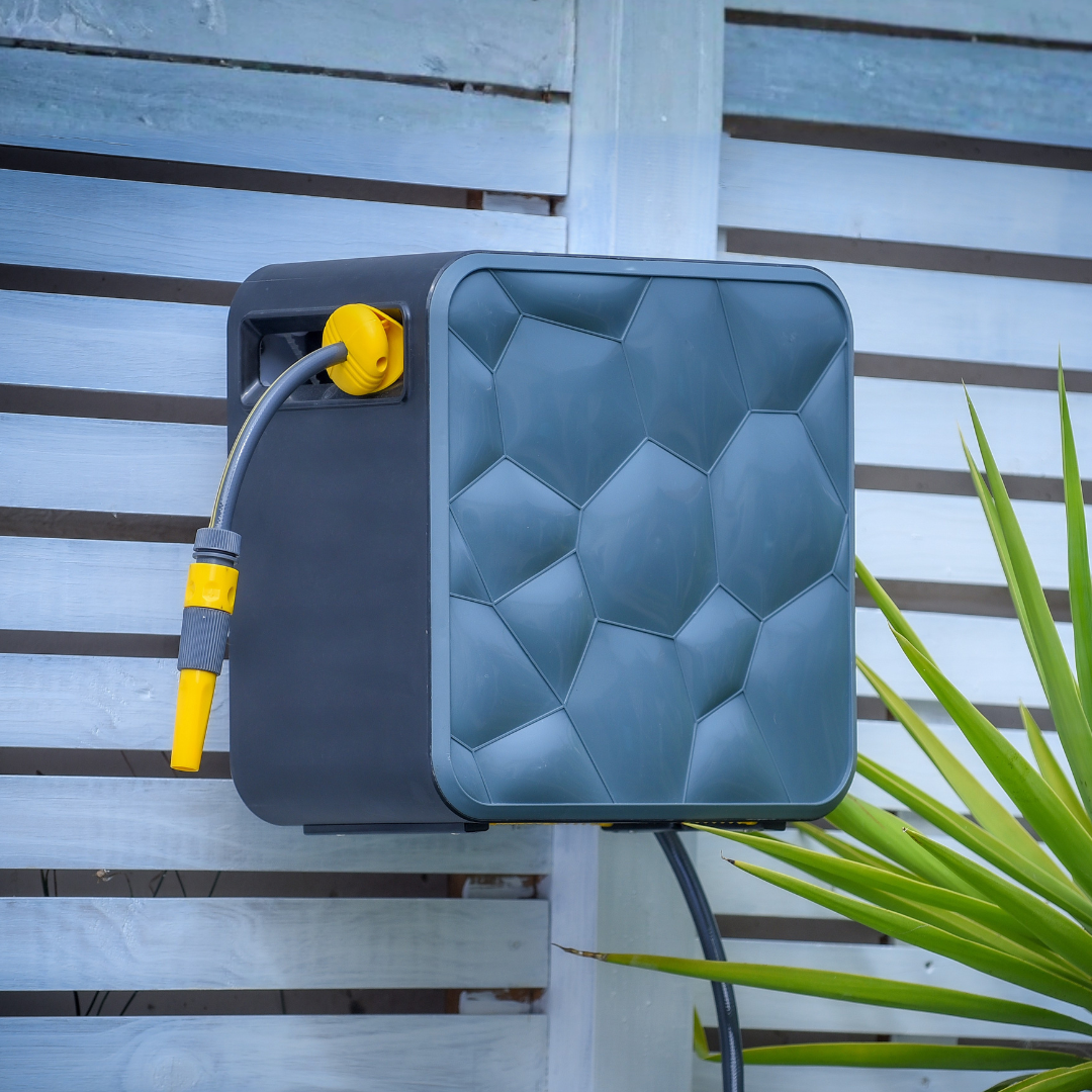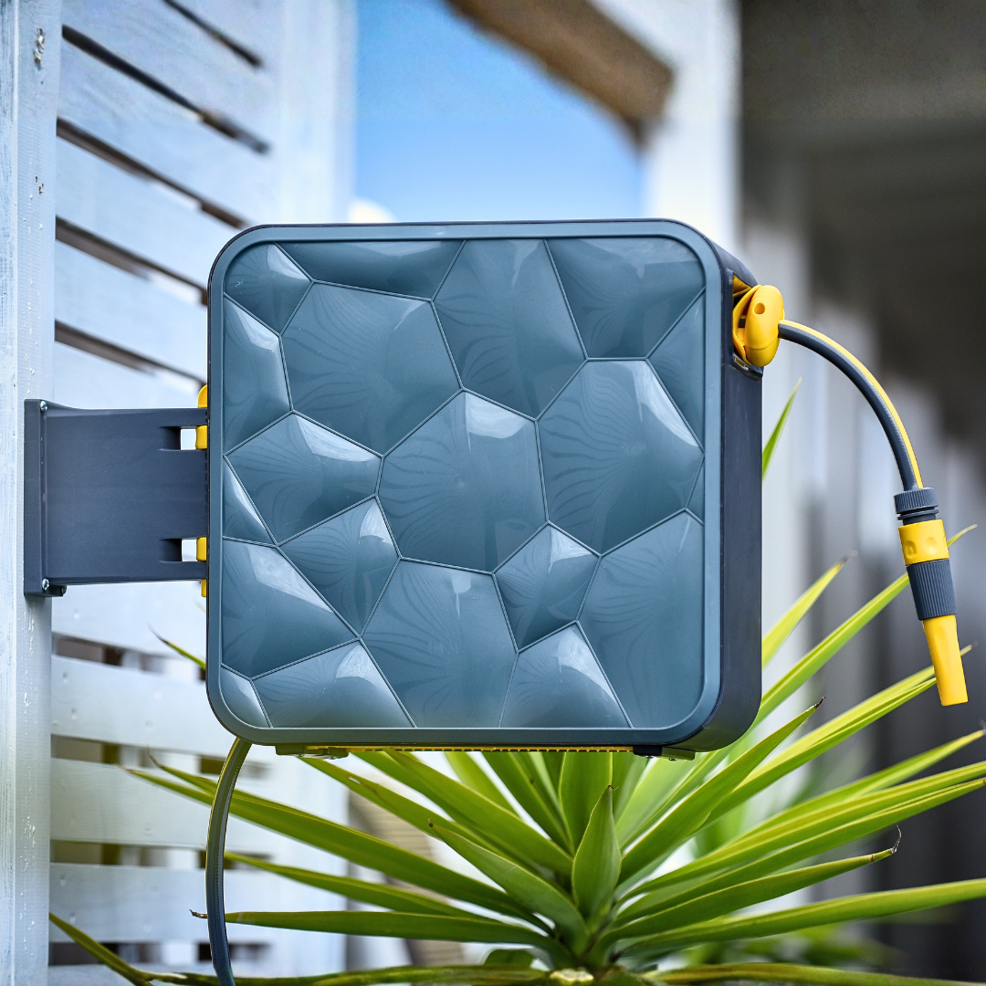 La manguera retráctil Tom Palmer se enrolla sola, evitando nudos, enredos y desorden. Su carcasa resistente al sol protege la manguera y prolonga su vida útil. Incluye todo lo necesario para anclarla al muro o instalarla con estacas en el suelo. Disponible en versiones de 20 m y 30 m, ideal para jardines, patios y terrazas.