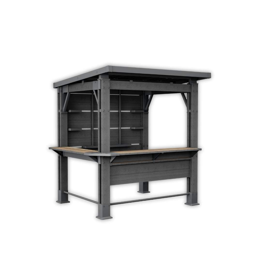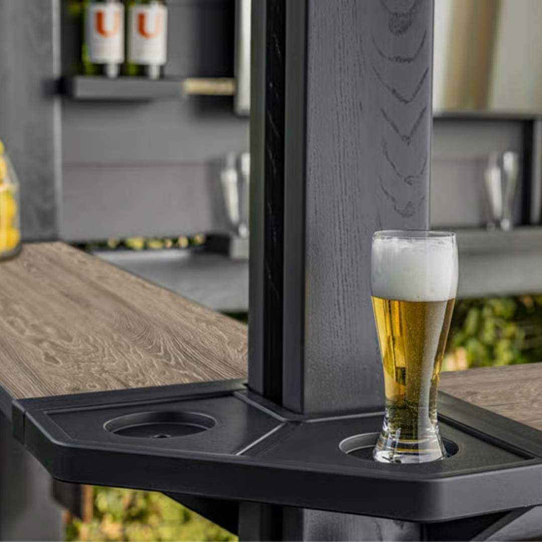 Incorpora barra frontal tipo bar, repisas laterales, estantes internos, rack para copas y botellas, y ganchos funcionales para colgar utensilios o iluminación decorativa. Su sistema de armado es simple y rápido: se instala fácilmente entre dos personas sin necesidad de herramientas especiales.