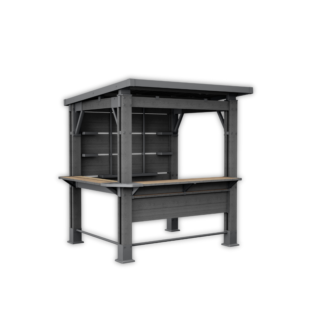 • Incluye: barra frontal, repisas laterales, estantes internos, ganchos funcionales, rack para copas y botellas, techo protector, ranuras para cableado