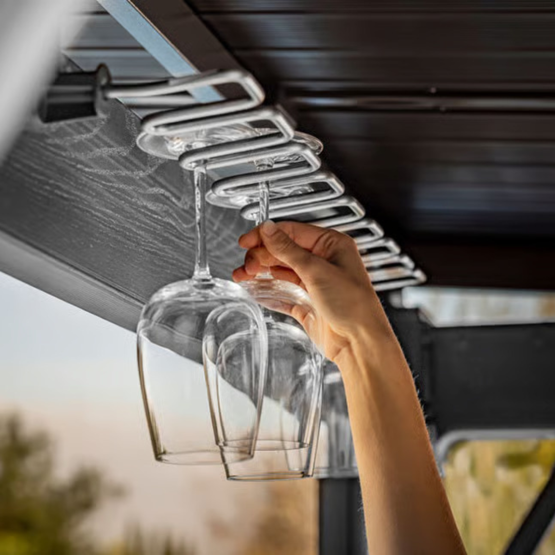 Su techo de policarbonato con protección UV permite disfrutar del exterior bajo sombra sin perder luz natural, mientras que su estructura reforzada soporta viento de hasta 90 km/h y carga de nieve de hasta 100 kg/m², garantizando durabilidad durante todo el año.