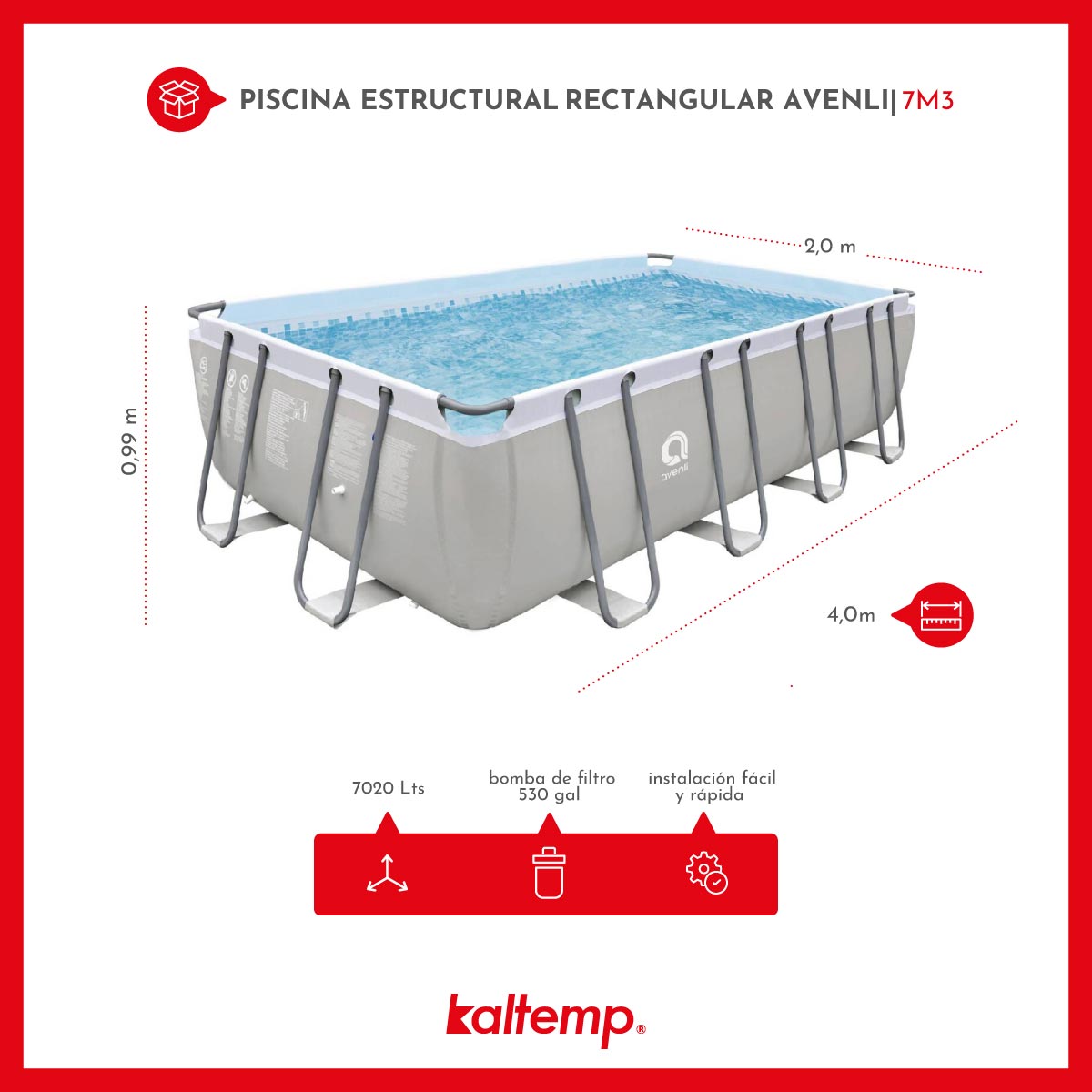 La piscina estructural Avenli Rectangular es la elección perfecta para aquellos que desean disfrutar del agua en su espacio al aire libre de manera rápida y sencilla. Con su instalación sin necesidad de herramientas, estructuras de acero Tech anticorrosión y pared de material LamTech de alta resistencia, garantiza una larga durabilidad. Además, es ideal para aprendices de natación y se adapta eficientemente a cualquier entorno exterior. Su diseño también incluye facilidades de almacenamiento que ayudan a ahorrar espacio, brindando una solución práctica y conveniente.
