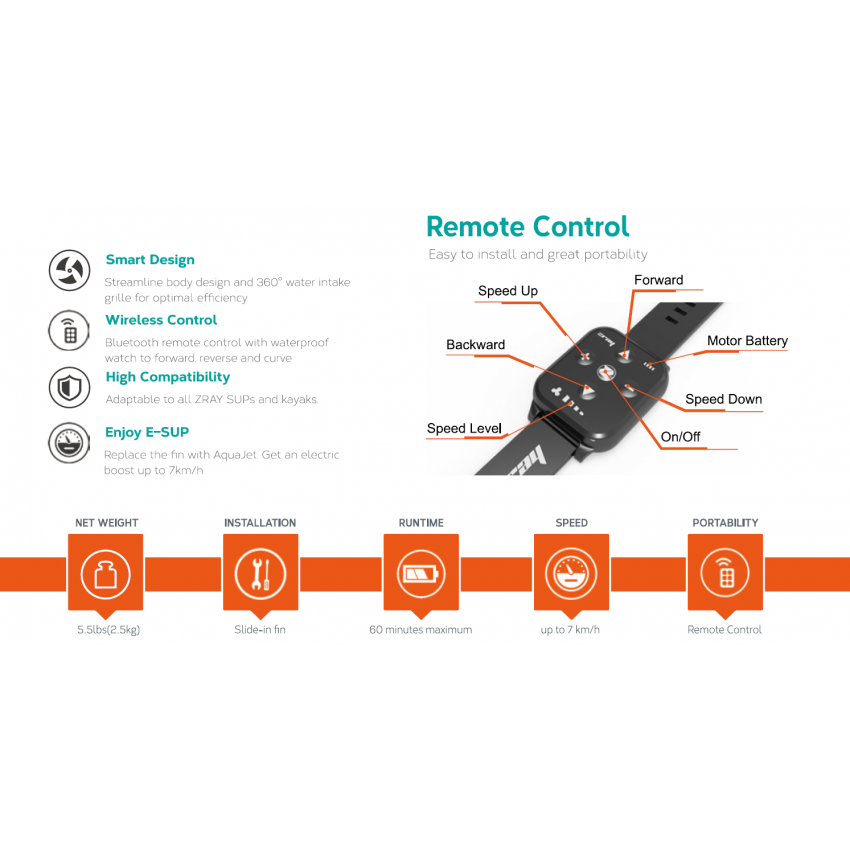 - Disfruta de E-SUP: Reemplace la aleta de su SUP por el Aquajet y alcance hasta los 7 km/h de velocidad con su tabla paddle surf.